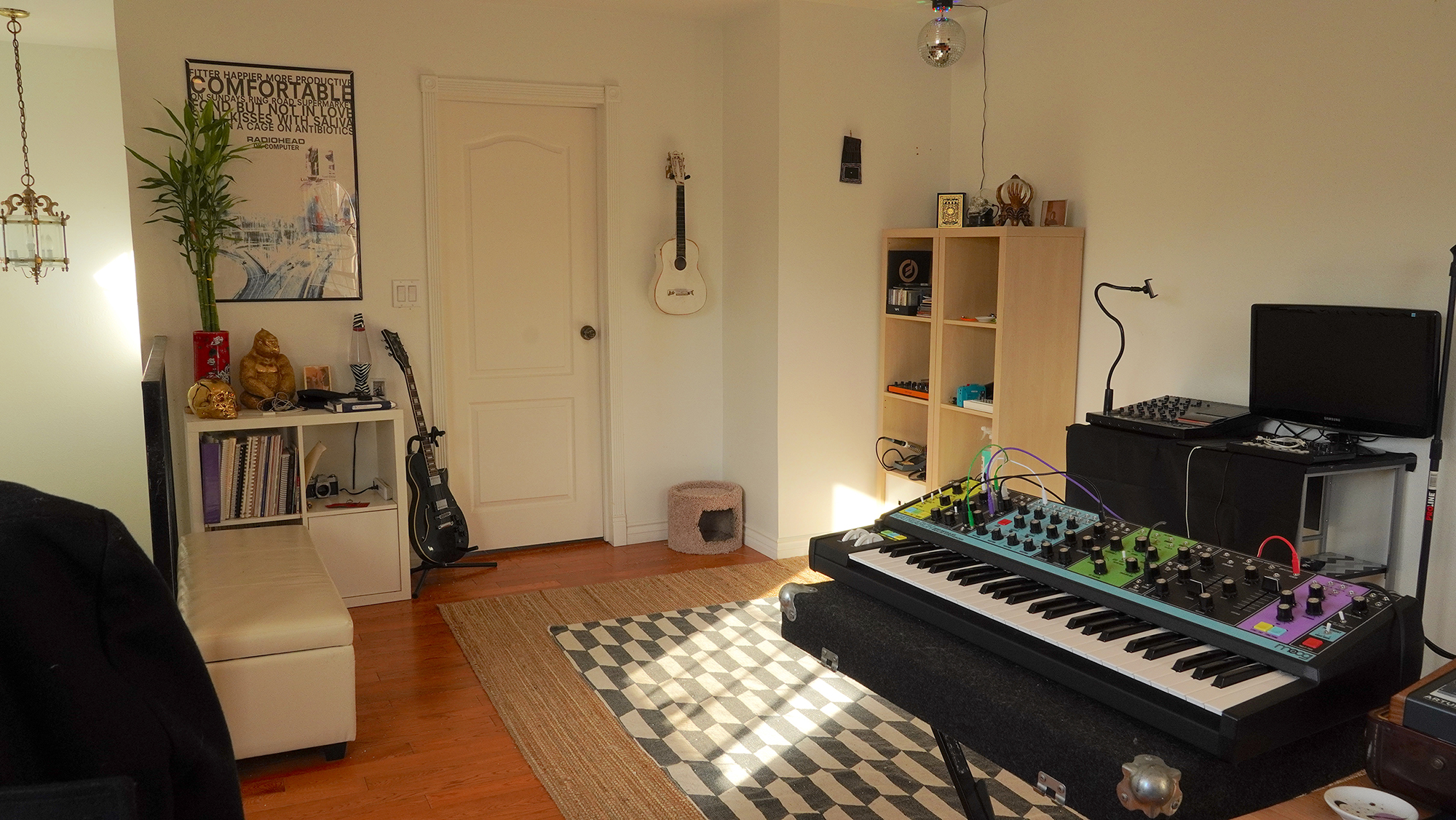 My space has to be comfortable, so I have different places where I can sit and space to lie down on the floor. The main room contains various pieces of audio equipment and computers, which I use for music and art. Music, code or videography all becomes part of my daily work at the main desk. I still get up, move around, grab and test things out, though. The other room functions as a live/rehearsal room in which I record loud sounds.” - László Bolender